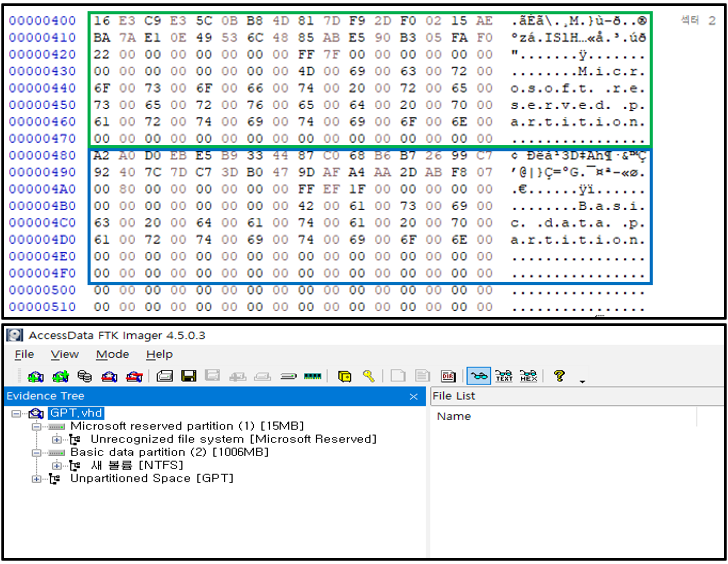GPT Partition Entry의 값을 보면 MSR이라고 해서 생성하지 않은 파티션이 자동으로 생성되어 있는 것을 확인할 수 있습니다. 위 그림에서는 초록색 네모 영역이 MSR에 대한 Entry 정보입니다.