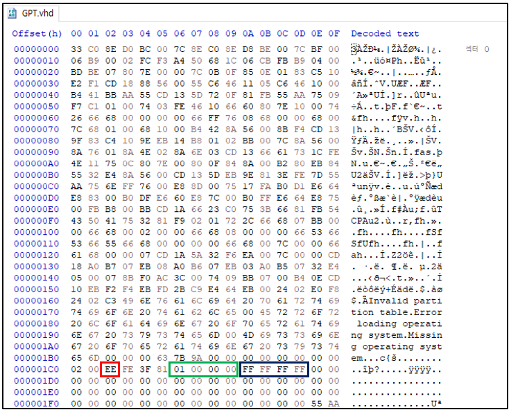 주목해야 할 점은 파티션 테이블의 값인데요, 파일 시스템 타입의 값이 0xEE 인데 이는 GPT를 사용하고 있다는 것을 의미합니다.