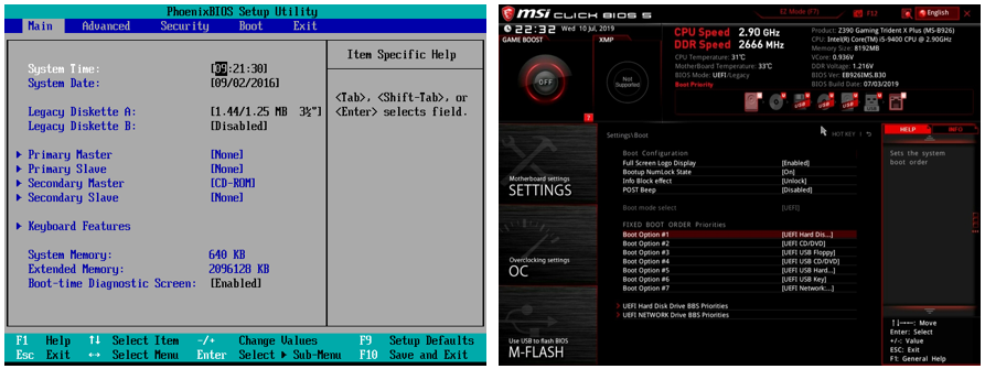 예전에 키보드로만 조작을 해서 세팅을 하던 것이 BIOS이고, 최근에 마우스도 활용할 수 있는 GUI 형태를 가진 것이 UEFI라고 보시면 되겠습니다.
