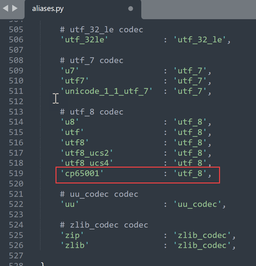 C:\Python27\Lib\encodings\aliases.py 파일의 utf_8 codec 부분에 'cp65001' : 'utf_8' 값을 추가해줍니다.