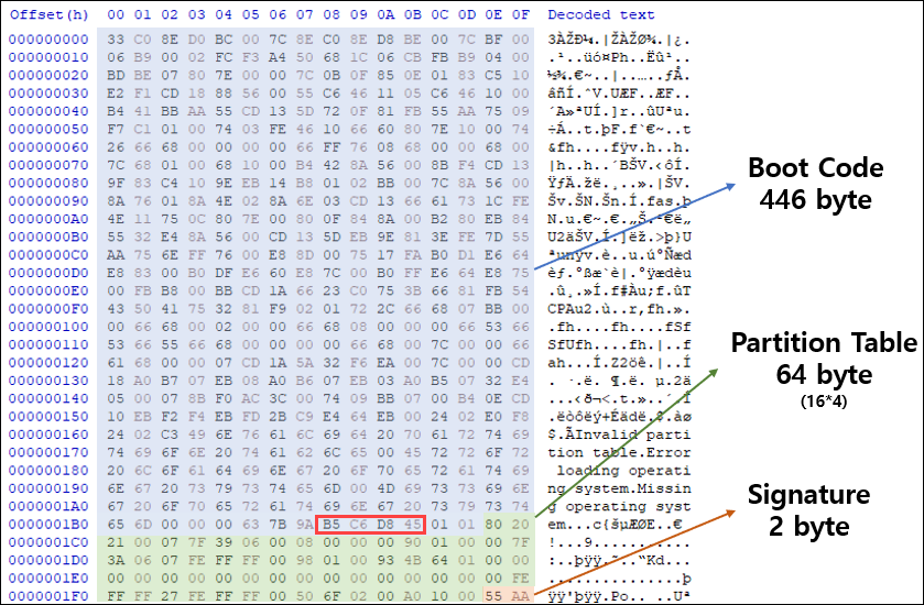 부트 코드 영역은 시스템을 부팅할 때 필요한 영역이며 파티션 테이블 영역은 파티션 하나 당 16 byte 씩 총 4개의 파티션에 대한 데이터가 저장되는 영역입니다. 시그니처 영역은 2 byte 크기인 0x55AA 값이 항상 고정되어 있으며 마지막에 위치하고 있어 MBR의 끝을 알 수 있는 값입니다.