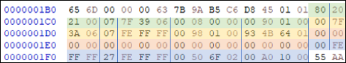 | 0x05 ~ 0x07 | 3 byte | CHS Address 끝 주소 | 실린더, 헤드, 섹터에 기반한 주소 지정 방식 끝 주소 |