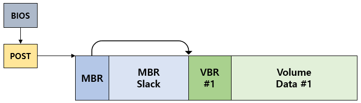 앞선 과정을 거치고나면 주 하드디스크 드라이브의 MBR 부트 코드를 호출합니다. (주 하드디스크는 BIOS 셋업 설정에서 변경할 수 있음)