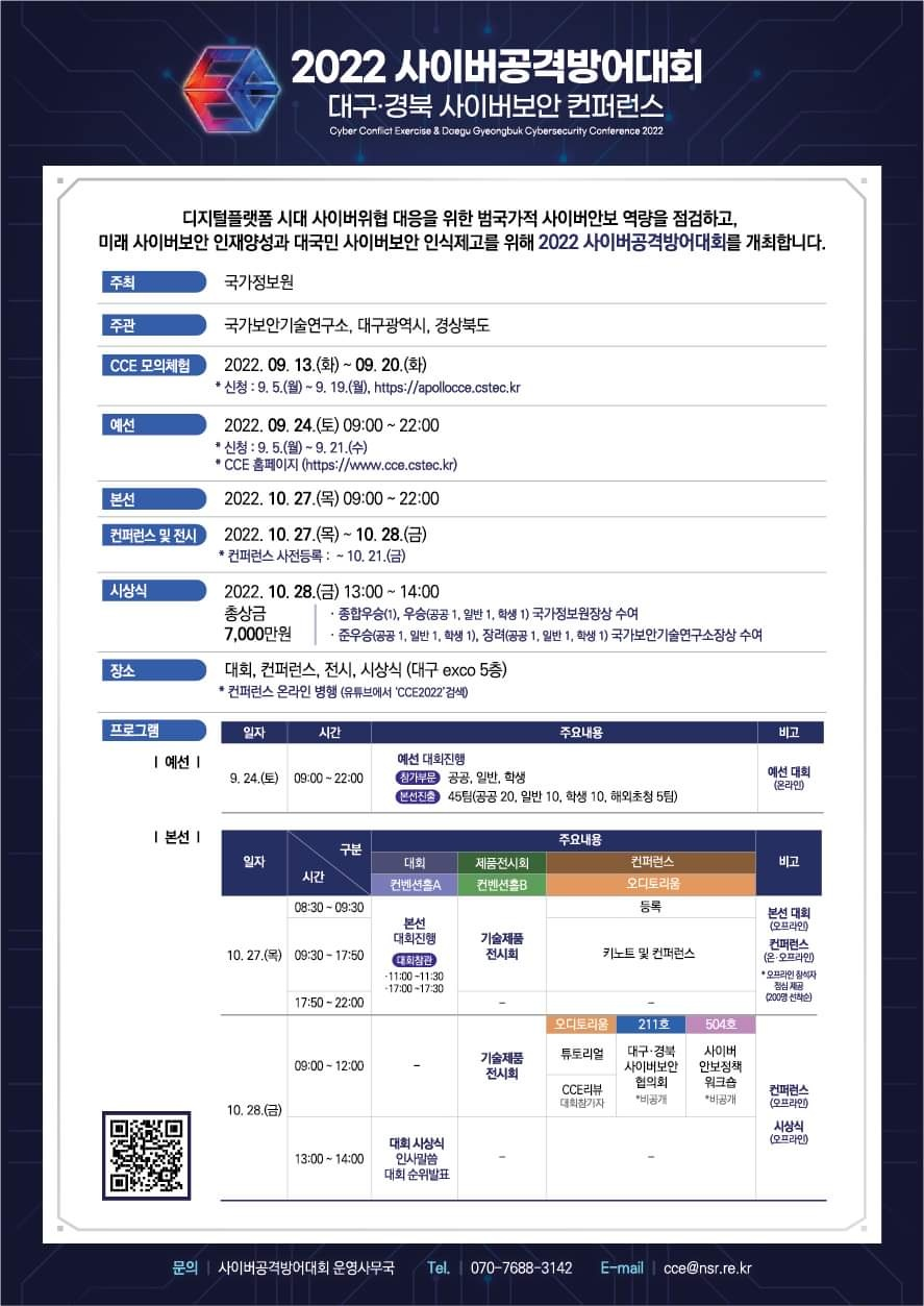 디지털플랫폼 시대 사이버위협 대응을 위한 범국가적 사이버안보 역량을 점검하고, 미래 사이버보안 인재양성과 대국민 사이버보안 인식제고를 위해 2022 사이버공격방어대회를 개최합니다.
