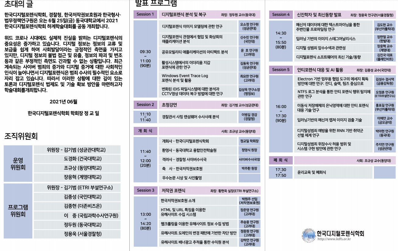 2021년 6월 25일 온라인으로 한국 디지털포렌식학회 하계 학술대회가 온라인으로 열립니다.