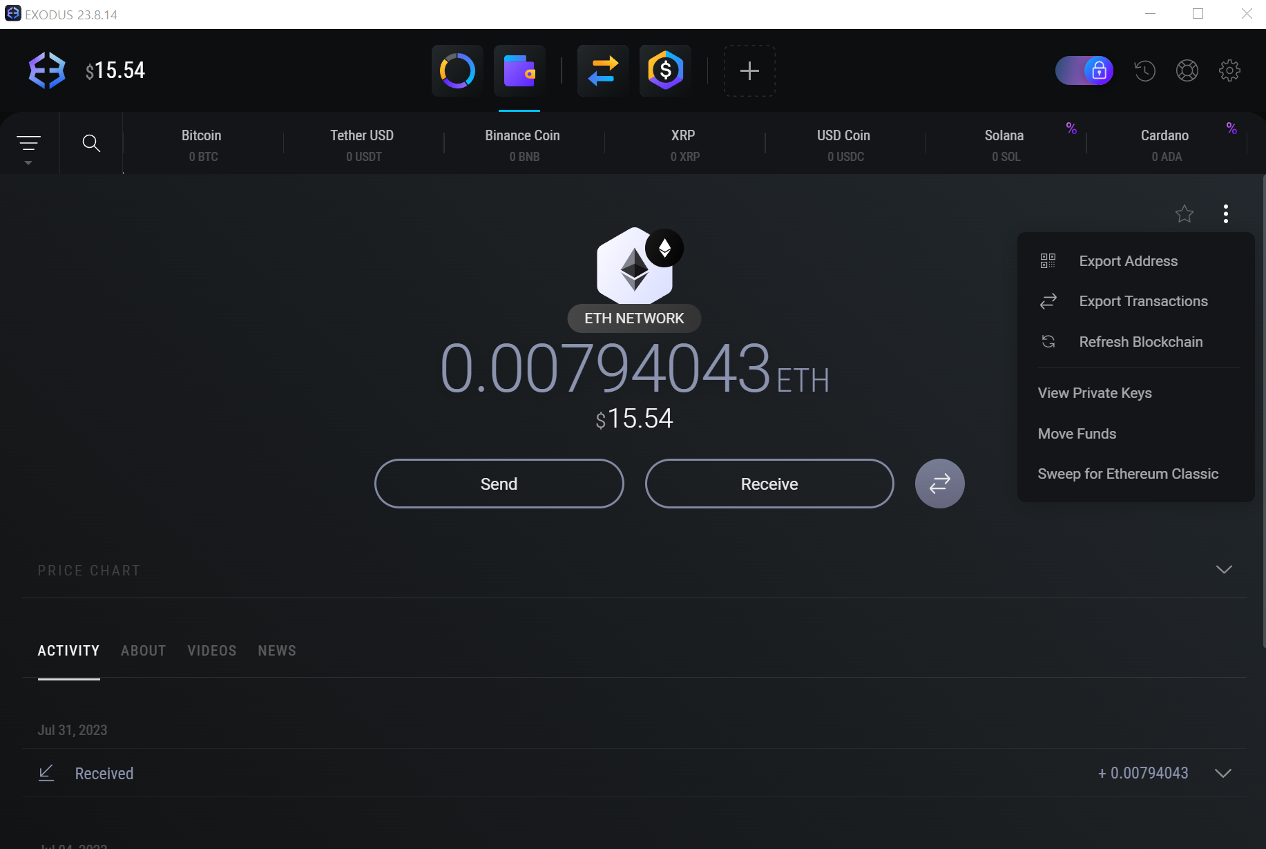 위 그림은 암호화폐 지갑 프로그램 중 "Exodus" 라는 프로그램의 이더리움 지갑 화면을 캡처한 것이다. 화면을 보면 현재 이더리움 지갑의 잔액, 수신 트랜잭션 정보 등을 얻을 수 있다. 그리고 우측의 메뉴를 보면 개인키를 조회할 수 있는 "View Private Keys"라는 기능이 존재하는 것을 알 수 있다.