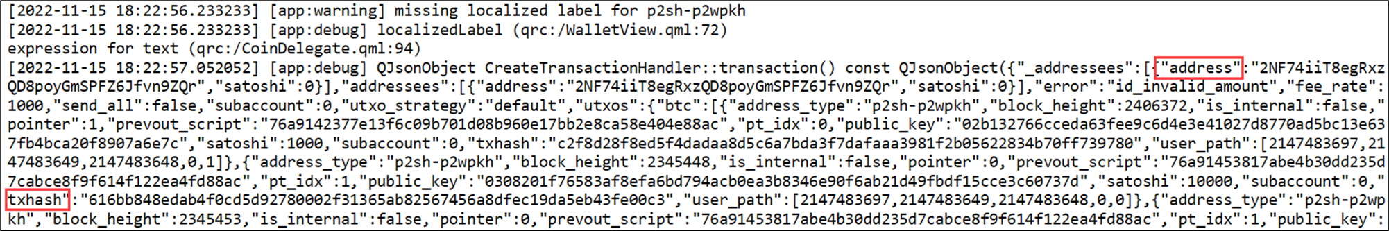 "Blockstream Green" 1.1.x 버전 대에서는 위 그림과 같이 암호화폐 주소와 트랜잭션 ID값을 로그로 기록하고 있기 때문에 사용자의 패스워드 없이 획득할 수 있는 중요한 아티팩트 중 하나였다.