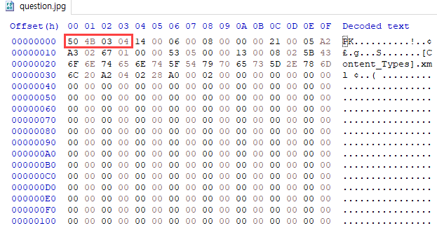 question.jpg hex 값을 확인해보면 파일 시그니처 값이 압축 파일의 시그니처와 동일한 것을 확인할 수 있습니다.