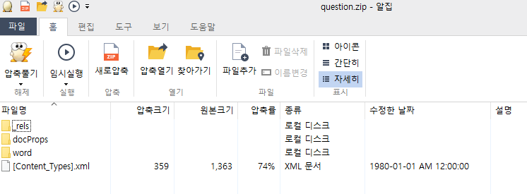 확장자를 zip으로 변경하고 파일을 열어보면 docx 파일의 구조를 가지고 있는 것을 확인할 수 있습니다.