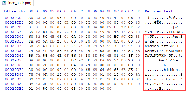 inco_hack.png 파일의 hex 값 가장 뒤를 보면 png footer signature 값 뒤에 PK 형식 파일의 데이터가 추가로 포함되어 있는 것을 알 수 있습니다.