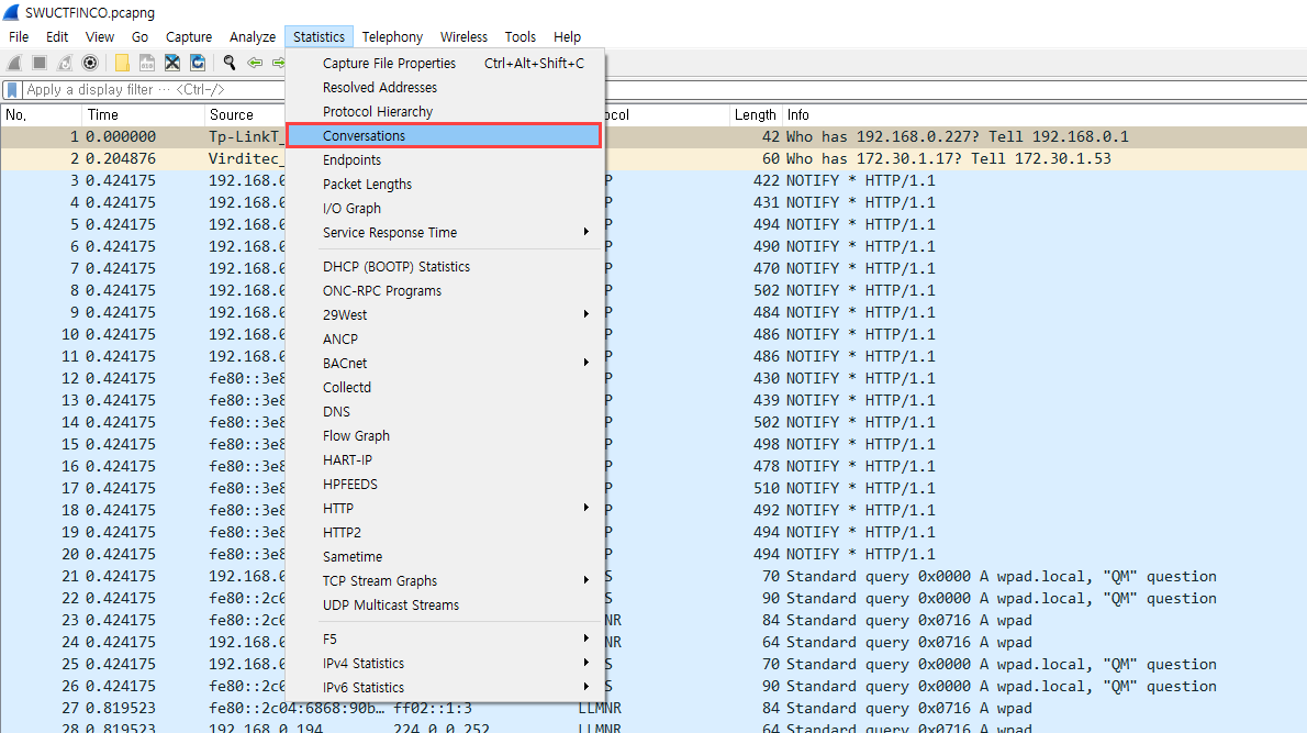 pcapng 형식이므로 wireshark로 파일을 열고 Statistics -> Conversations 를 통해 분석을 시도했습니다.