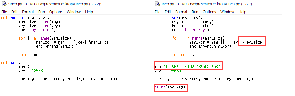 따라서 얻어낸 Shellcode 결과 값을 다시 ascii 값으로 변환한 뒤 msg 값에 대입하고 msg_size를 key_size로 변경해주면 원본 메세지를 획득할 수 있습니다.
