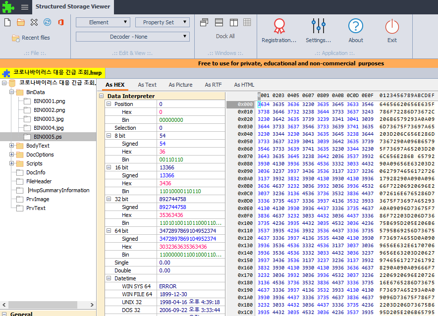 SSView를 사용하여 해당 hwp 파일을 열어봤을 때 BinData 경로에 .ps 파일이 존재했습니다.