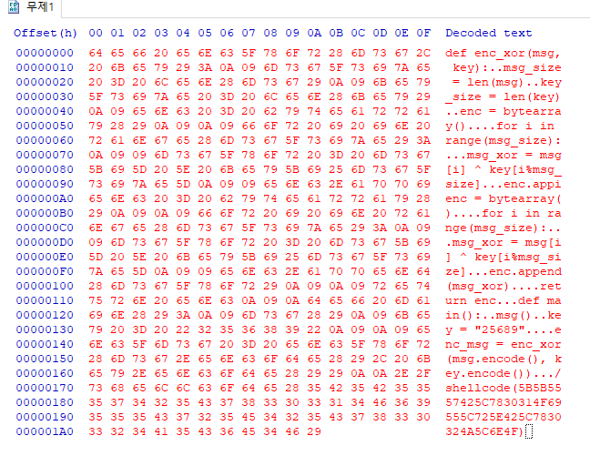 해당 문자열을 HxD를 사용하여 변환하면 파이썬 코드와 쉘코드 값을 획득할 수 있습니다.