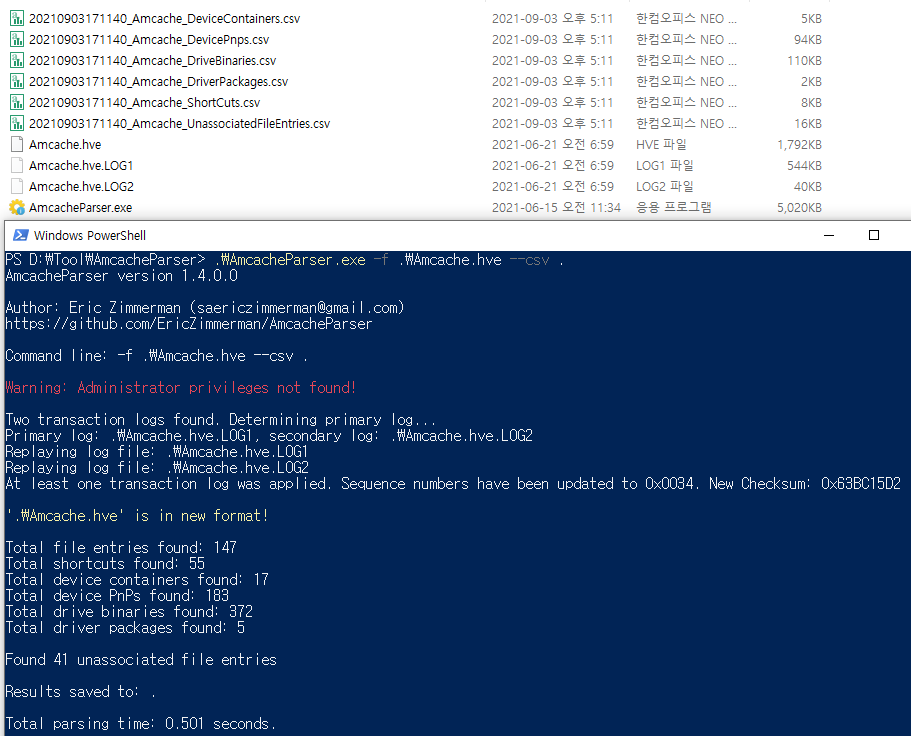 Eric Zimmerman의 AmcacheParser를 사용하여 암캐시 파일을 파싱했습니다.