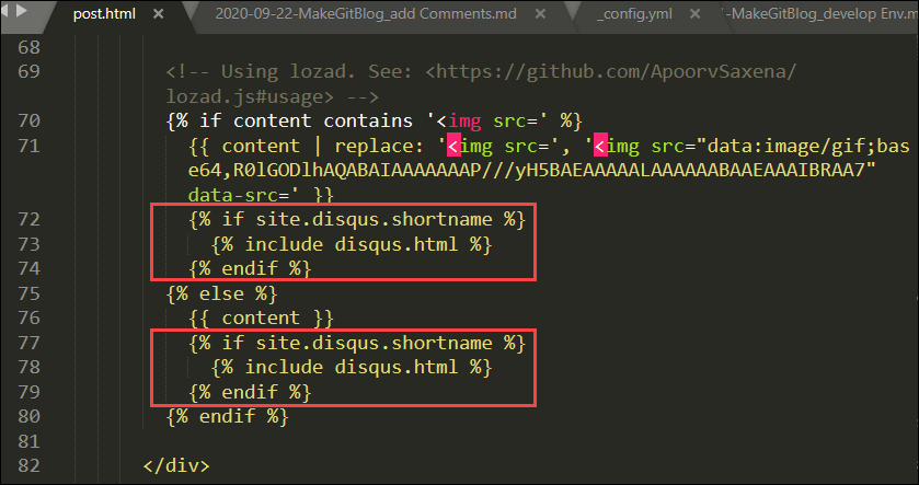 _layout폴더내에 있는 post.html 파일을 수정해줘야 합니다. 이 파일의 역할은 포스팅되는 페이지의 구조를 담당하고 있는데요, 이 파일에서 아까 생성한 disqus.html 파일을 호출해줘야 합니다. 이 부분도 테마마다 소스코드가 다를 수 있습니다.html파일 구조를 아시는 분들은 본문에 대한 코드 바로 뒤에 빨간네모로 표시한 소스 코드를 입력하시면 됩니다.