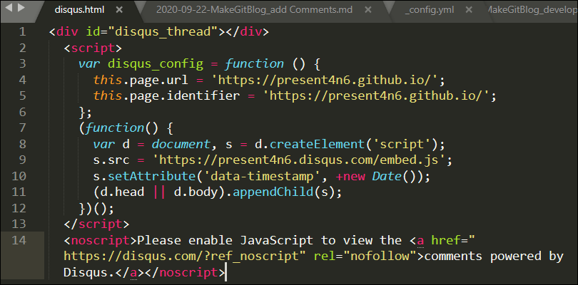 요약해보자면 disqus API를 불러오는 disqus.html 파일을 생성하고 포스트를 담당하는 html 파일인 post.html 파일에서 disqus.html 파일을 호출할 수 있도록 설정해준 것입니다.