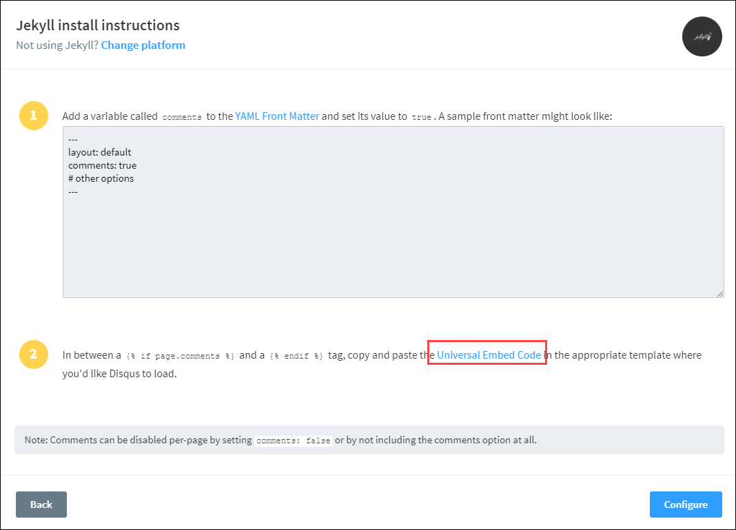 disqus를 Jekyll에 적용하는 방법에 대한 가이드를 해줍니다.Universal Embed Code링크를 눌러서 이동해줍니다.