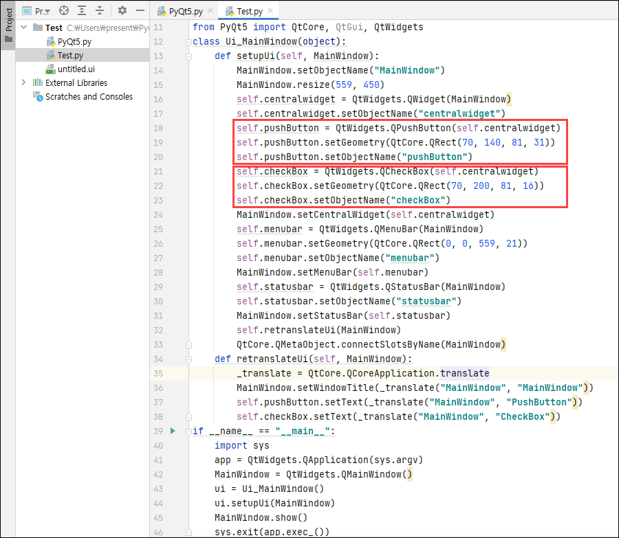 - ui 파일을 파이썬 코드로 변환을 하게 되면 아래와 같은 소스코드를 확인할 수 있습니다. Designer에서 작업했던 내용이 파이썬 코드로 적용이 된건데요, 제가 추가했던 Button과 CheckBox 위젯에 대한 코드도 있는 것을 알 수 있습니다.
