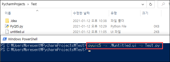 - 프로그램을 실행하기 위해서는 ui 파일을 파이썬 코드로 변환을 해주어야 합니다. 변환을 하는 방법은 ui 파일이 저장된 경로에서 파워쉘이나 CMD를 사용해서 다음 명령어를 수행하면 됩니다.