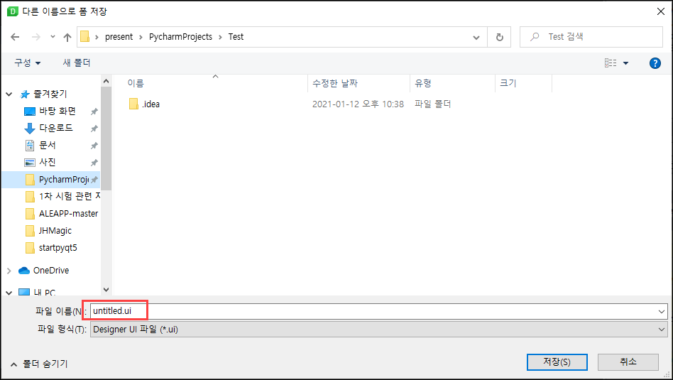 - 그리고 실행을 하기 전에 Designer에서 작업한 내용을 저장해줘야 합니다. .ui 파일로 저장이 되는데 이 파일은 Designer에서 읽어오기 위한 파일이며 나중에 Designer에서 이 파일을 불러오기 해서 작업을 이어서 진행할 수 있습니다.