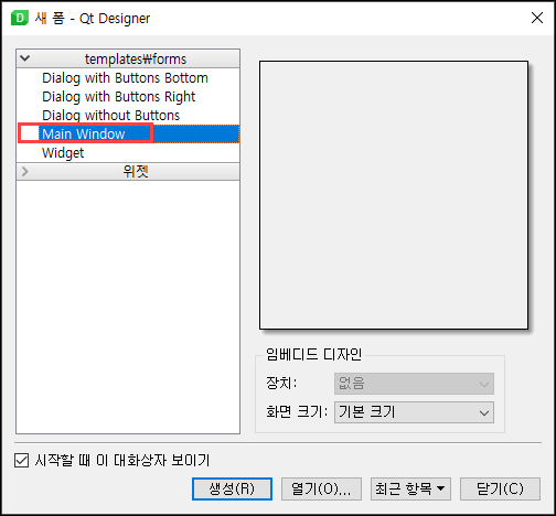 Main Window를 선택하고 생성을 해줍니다.