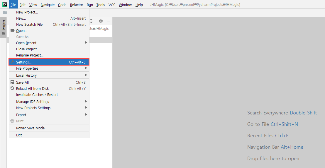 - PyCharm을 실행한 뒤 메인 화면에서 File -> Settings 탭을 열어 줍니다.