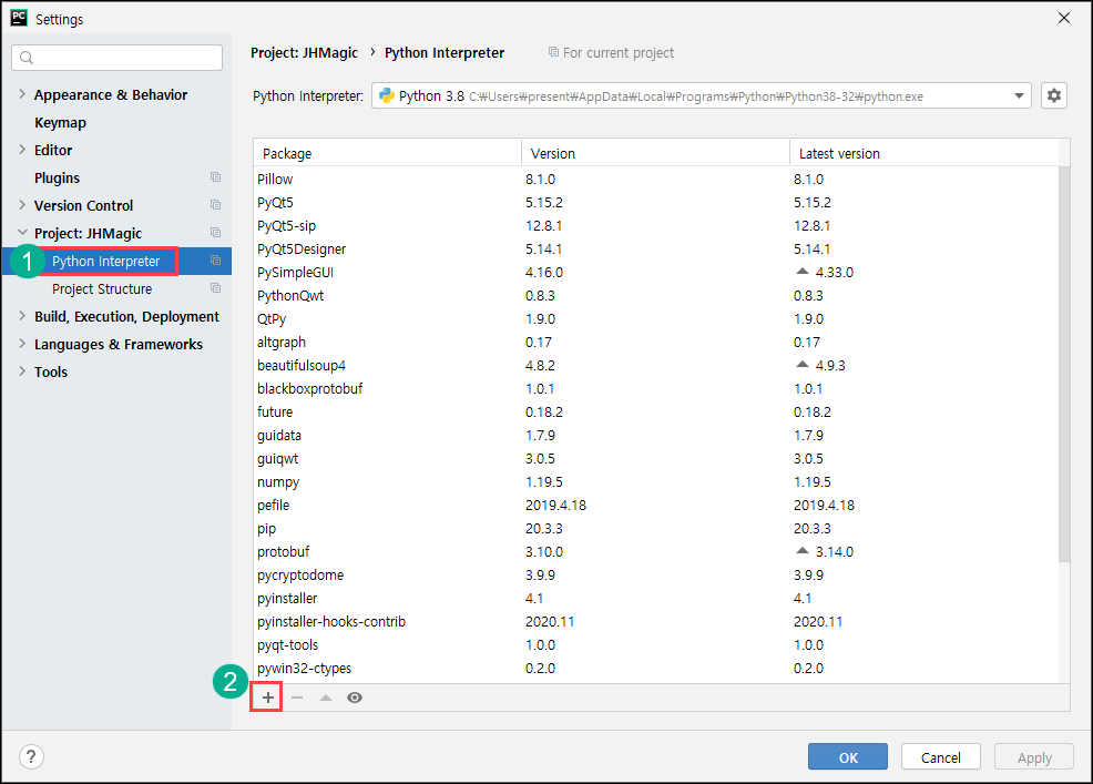 - 그리고 Projects 탭의 Python Interpreter를 누르고 하단의 + 버튼을 클릭합니다.