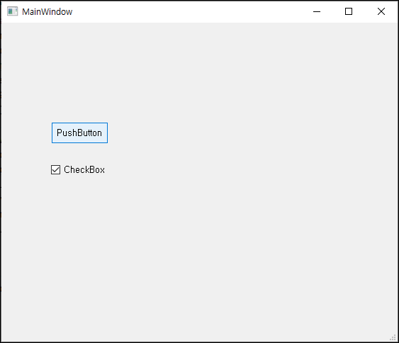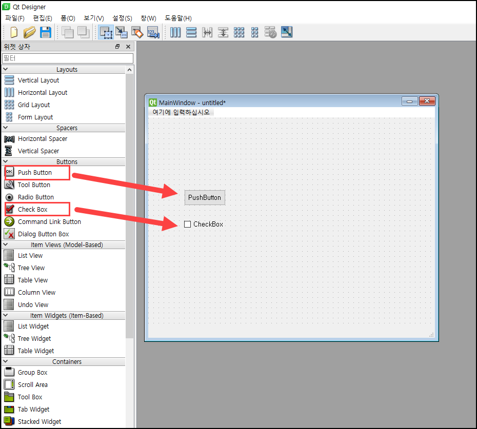 Buttons탭의Push Button과Check Box위젯을 Main Window에 배치를 해봤습니다.