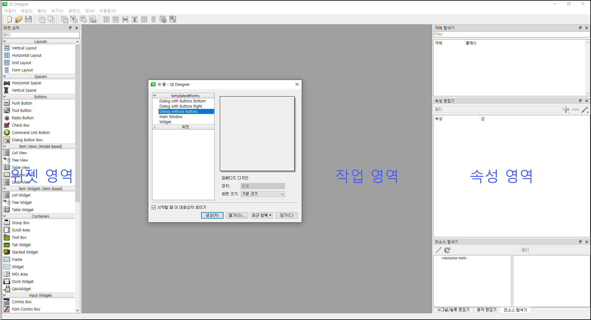 - Designer가 실행되면 아래와 같은 화면을 볼 수 있습니다. 화면이 세로로 3등분이 되어있는데 좌측이 사용할 수 있는 위젯들이 위치한 위젯 영역, 가운데가 실제 GUI 디자인을 하는 작업 영역, 우측이 위젯들의 속성을 변경할 수 있는 속성 영역입니다.