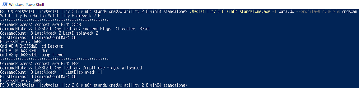 .\volatility_2.6_win64_standalone.exe -f data.dd --profile=Win7SP1x64 cmdscan